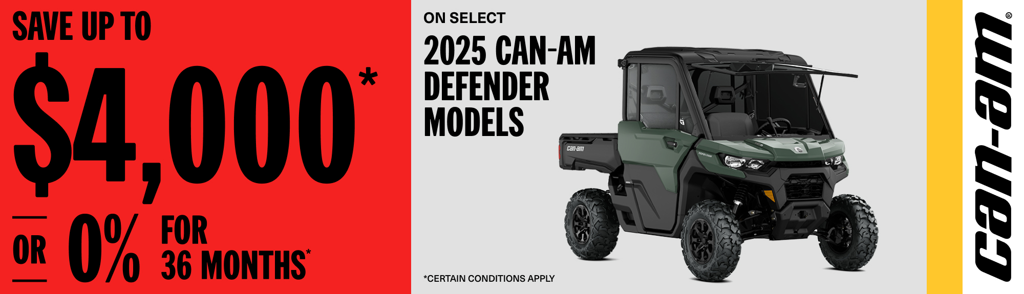 Rebate of up to $4,000 or 0% for 36 months on select 2025 Can-Am Defender models