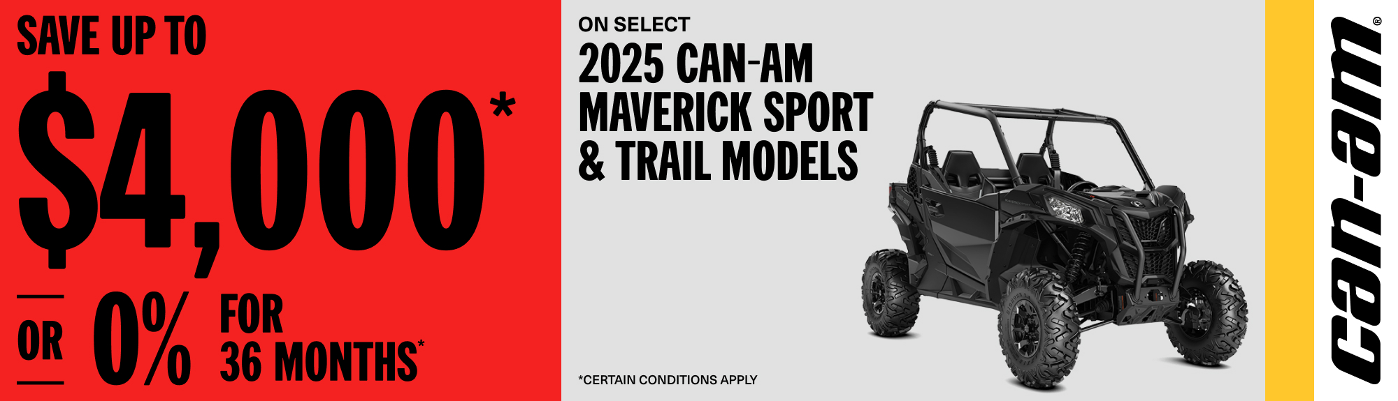 Rebate of up to $4,000 or 0% for 36 months on select 2025 Can-Am Maverick Trail & Sport models